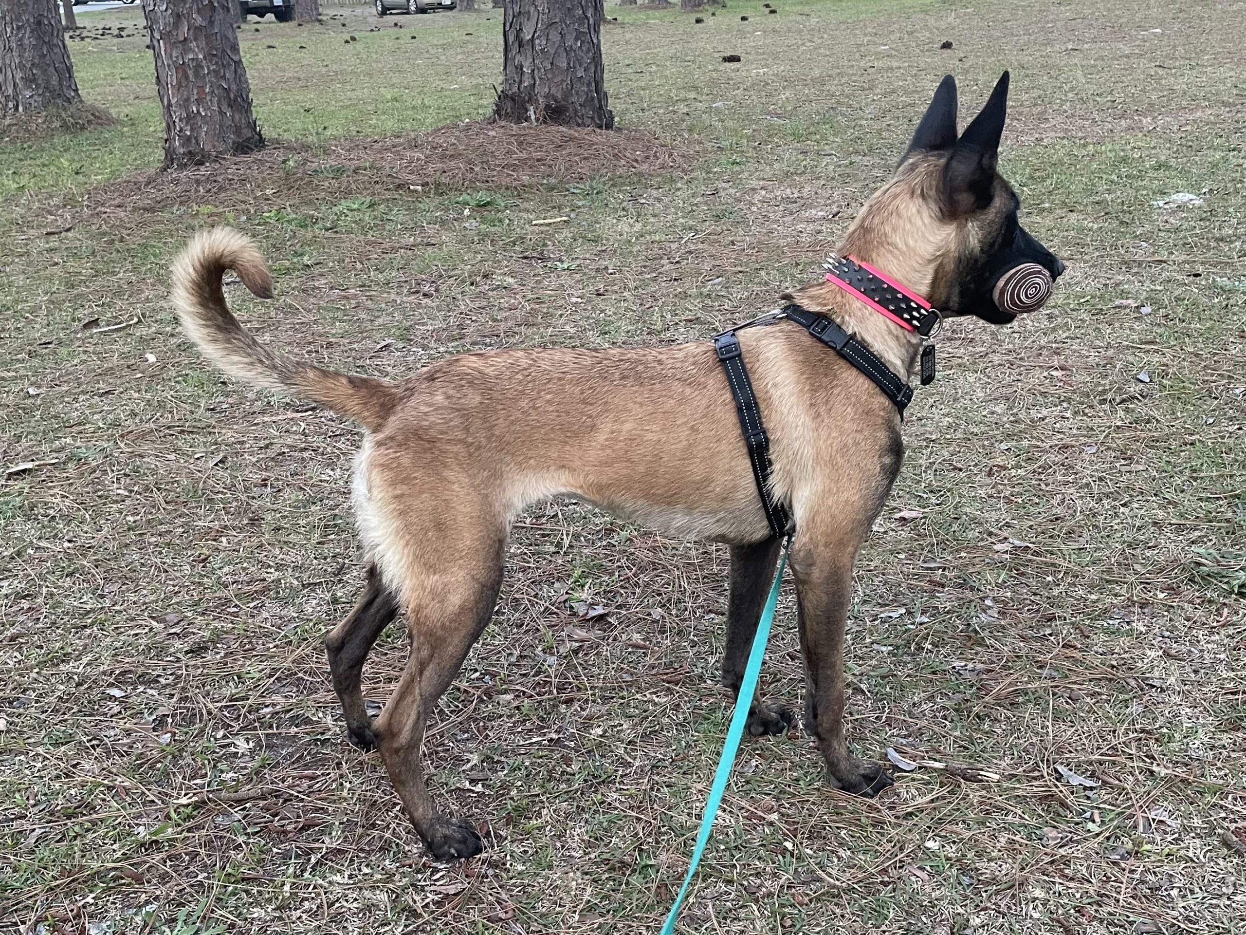 When you start seeing some minor stress signals, it’s time to intervene – cue your dog and start practicing one of your training routines while you manage your distance from the trigger. In the photo above, Leaf the Malinois had just entered the Yellow Zone. You can tell by looking at her body language – she is stiff, her tail is up and rigid, her ears are erect and angled far forward, and her body is angled like an arrow towards the trigger. It’s hard to see movement in a photo, but she was completely frozen. Right after taking this pic, we started playing some behavior games!